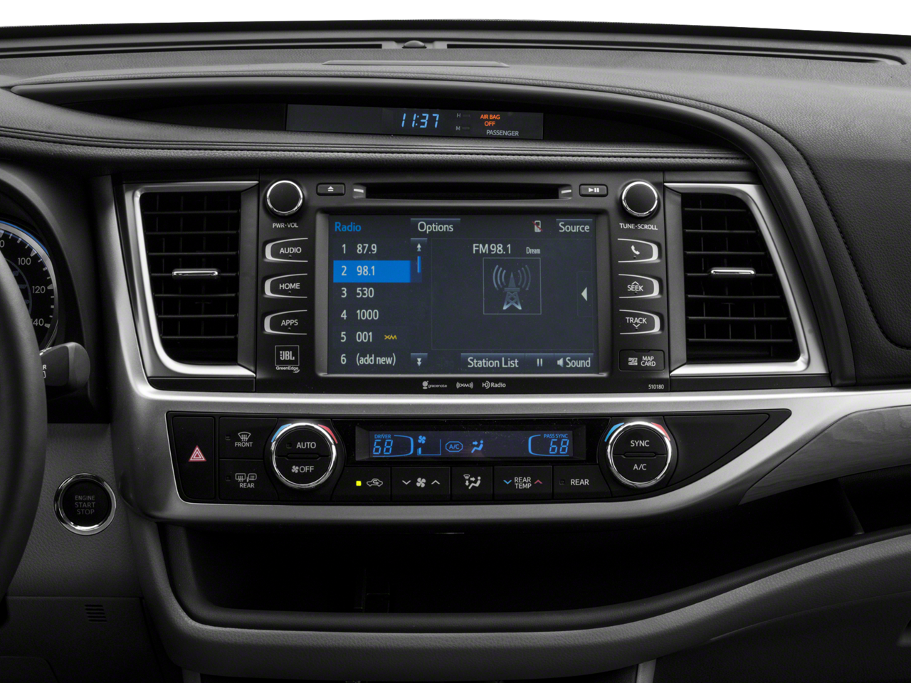 - Radio: Entune Premium JBL Audio w/Nav & App Suite -inc: the Entune Multimedia Bundle (8" high resolution touch-screen w/split screen display, AM/FM CD player, MP3/WMA playback capability, 12 JBL GreenEdge speakers, auxiliary audio jack, USB 2.0 port w/iPod connectivity and control, advanced voice recognition, hands-free phone capability, phone book access and music streaming via Bluetooth wireless technology), Siri Eyes Free, Entune App Suite, Intelligent Touch controls, SiriusXM Satellite Radio w/3-month complimentary SiriusXM All Access trial, HD Radio, HD Radio predictive traffic and Doppler weather overlay, AM/FM cache radio, Gracenotes album cover art and integrated backup camera display w/dynamic gridlines